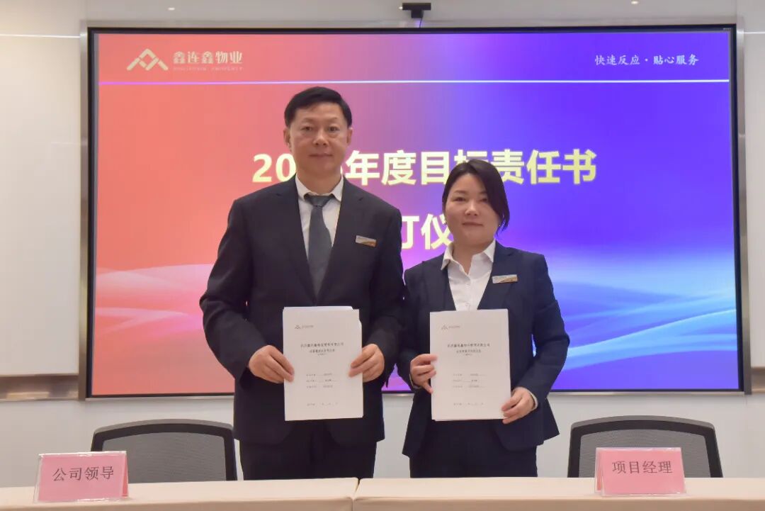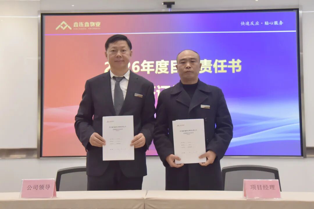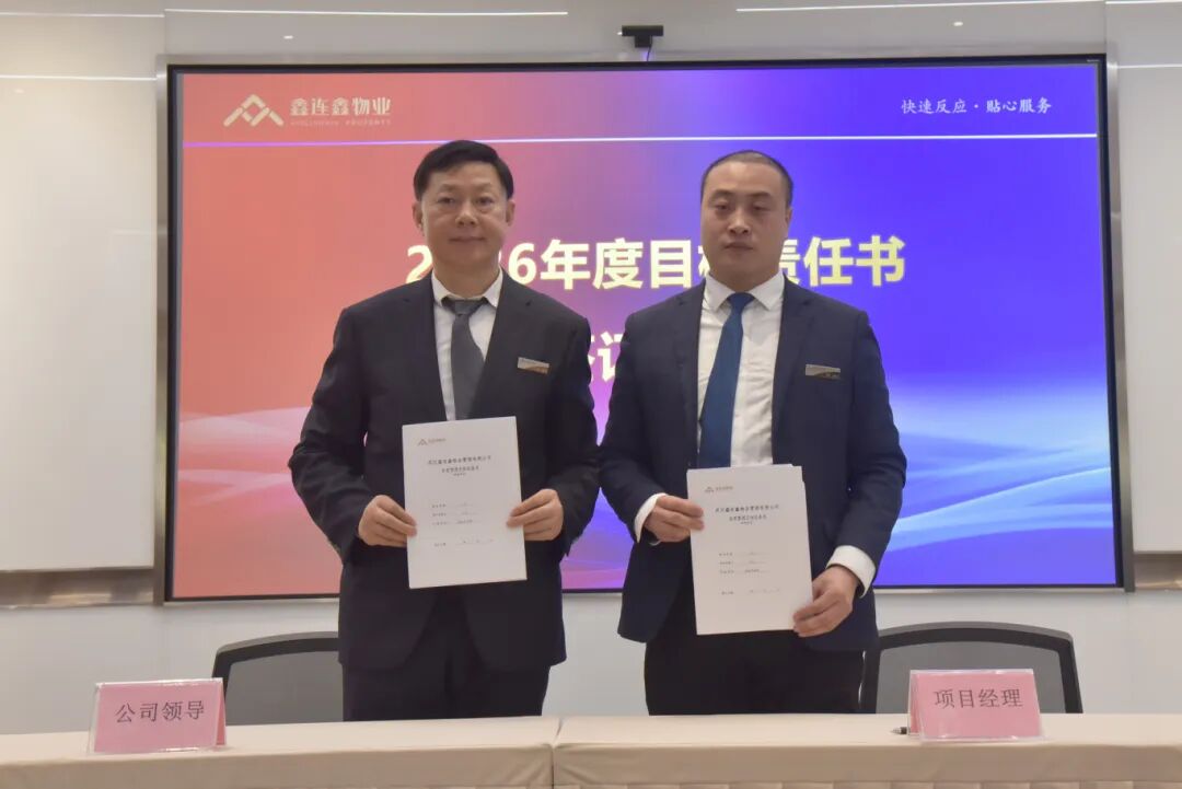 且看春风初解意,更催战鼓再出征。3月21日,武汉鑫连鑫物业管理有限公司2026年度目标责任书签订大会在公司总部大会议室召开,总部及各项目部核心骨干齐聚一堂、同心聚势,以定目标、明责任、强担当的坚定姿态,在“十五五”开局之年落下企业高质量发展的关键一子,为全年发展筑牢根基、擘画新篇。